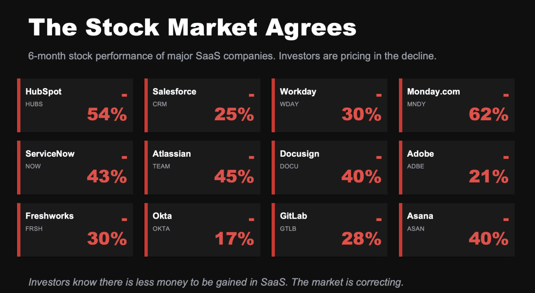 The market sees it too. HubSpot is down 54% over six months. Monday.com dropped 62%. ServiceNow fell 43%. Investors are pricing in the decline because they understand what’s happening.