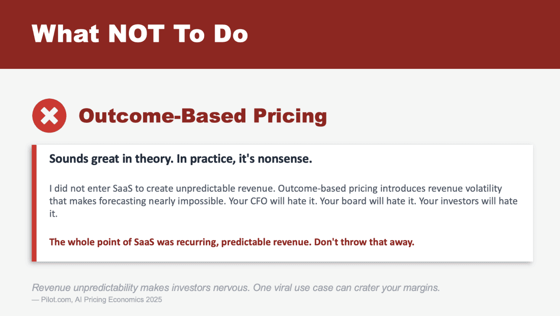 Outcome-based pricing sounds appealing, but does it work? Revenue unpredictability makes investors nervous. Your CFO will dismiss it. Your board will hate it. The whole point of SaaS was recurring, predictable revenue. Don’t throw that away chasing a pricing model that introduces volatility you can’t control.