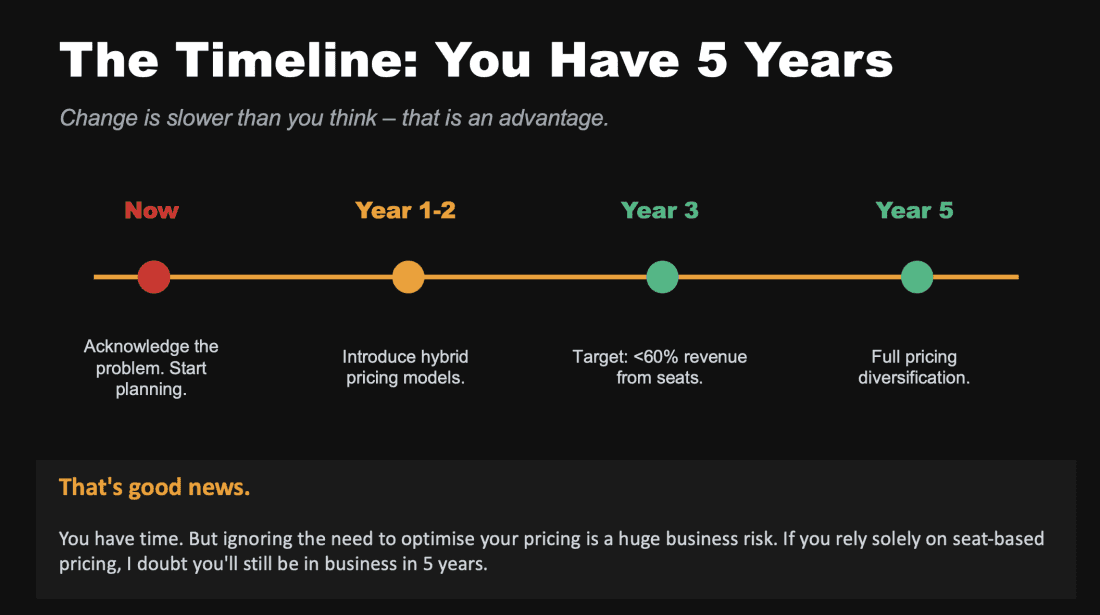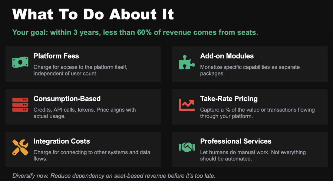 Your GTM leadership team needs to meet with product to determine which changes enable your survival. First, audit your revenue mix. How much depends on seat count today? Second, identify 2-3 alternative pricing levers you can introduce within 12 months. Third, align GTM and Product on the transition roadmap. The clock is ticking. The market won’t wait for you to figure this out.
