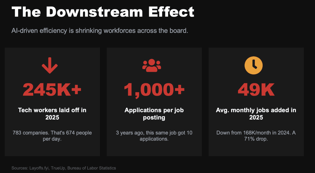 The data backs this up. Tech companies laid off 245,000 workers in 2025 across 783 companies. That’s 674 people per day. Job postings that received 10 applications three years ago now get over 1,000. Monthly tech job additions dropped from 168,000 in 2024 to 49,000 in 2025—a 71% decline.